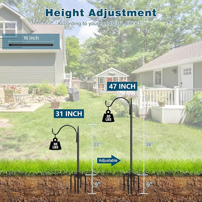 - 【HIGH QUALITY & ADJUSTABLE】 The height of the shepards hooks for outdoor is 47 inch. Our garden hook is made of high quality iron, the black coating on the surface is rust resistant. The height of the shepherds hook for bird feeder can be adjusted by adding or reducing the pole sections, each pole section is 16 inch. So you can adjust the height to 31 inch.