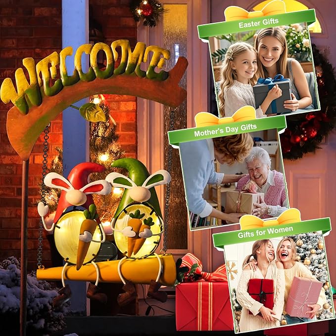 HONGLAND Solar Lights Outdoor Decor, Rabbit Swing Garden Decor, Funny Gardening Gifts for Women Mom, Gnomes Outdoor Decorations with Welcome Sign for Front Porch Patio