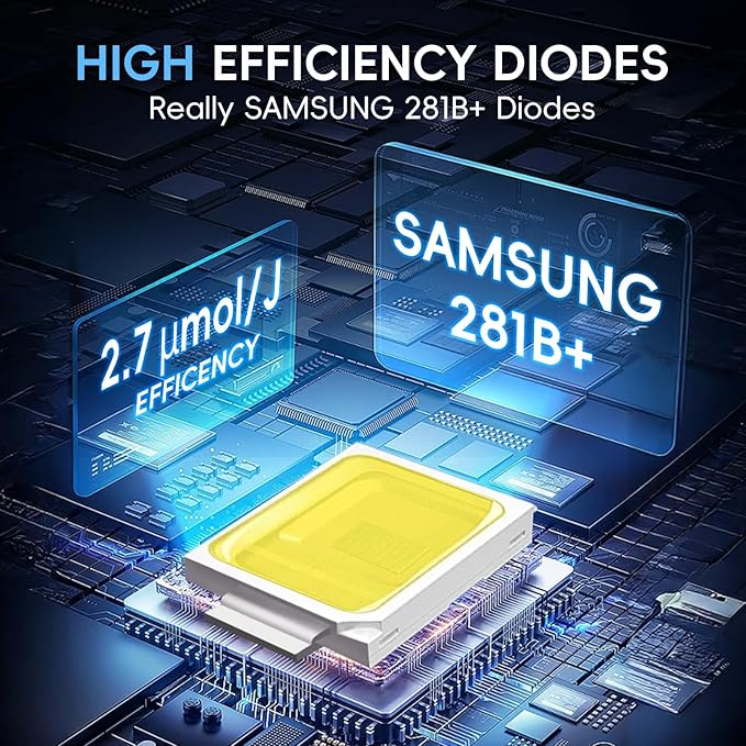 - 120W / with SAMSUNG LM218B+ DIODES(512Pcs):URBZUE's plant grow lights full spectrum 100% uses with SAMSUNG diodes, offering not only high-efficiency spectrum output, long lifespan, and energy efficiency, but also environmental friendliness and minimal color temperature shift.