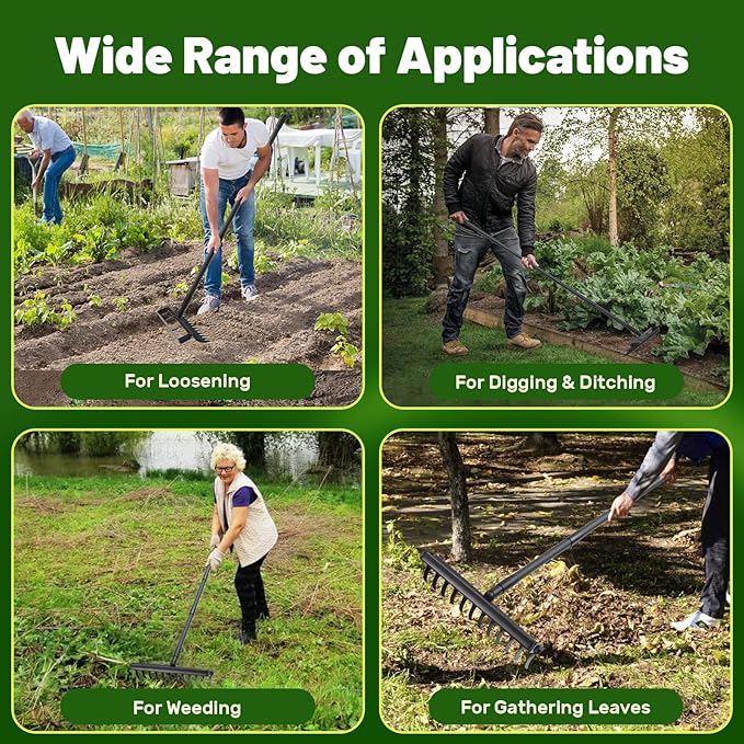 - Adjustable Long Handle: The handle length is adjustable from 21.26 inches to 76.77 inches, making it versatile for people of different heights. No need to bend your back and knees while gardening,protects your waist and knees.The design of the rake head is more in line with ergonomics and can be used in diverse scenarios without adjusting the angle of holding the handle.