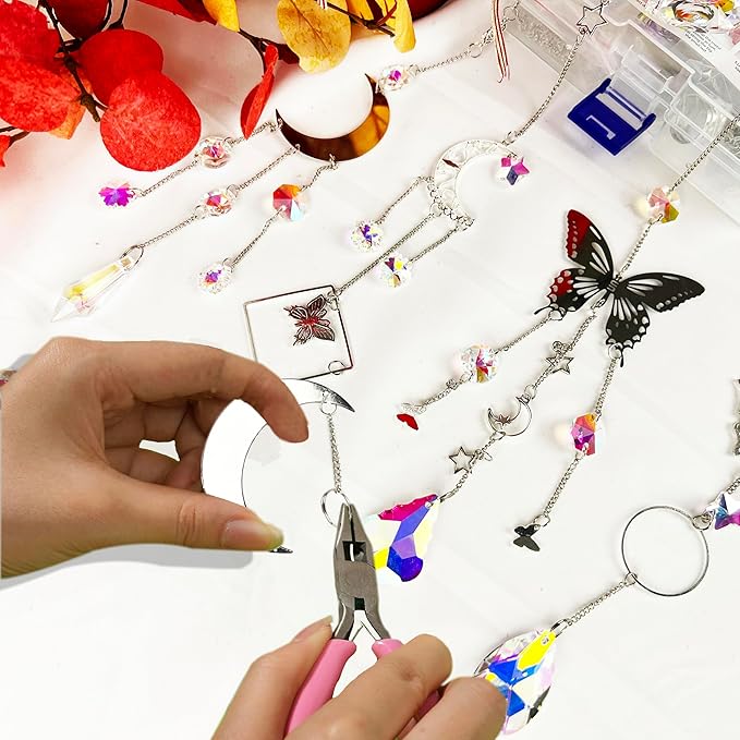 - Suncatchers Making Kits:This sun catchers crafts kit included totally 300pcs+ accessories. 36Pcs different size and sharped crystals , 35pcs silver hanging decors(butterfly, moon, stars, sun, circles, squares etc), 10pcs S shaped hooks,49pcs three different lengths of silver chain, two sizes of jump rings and tools.Package have enough quantity and tool allowing for a creativity.