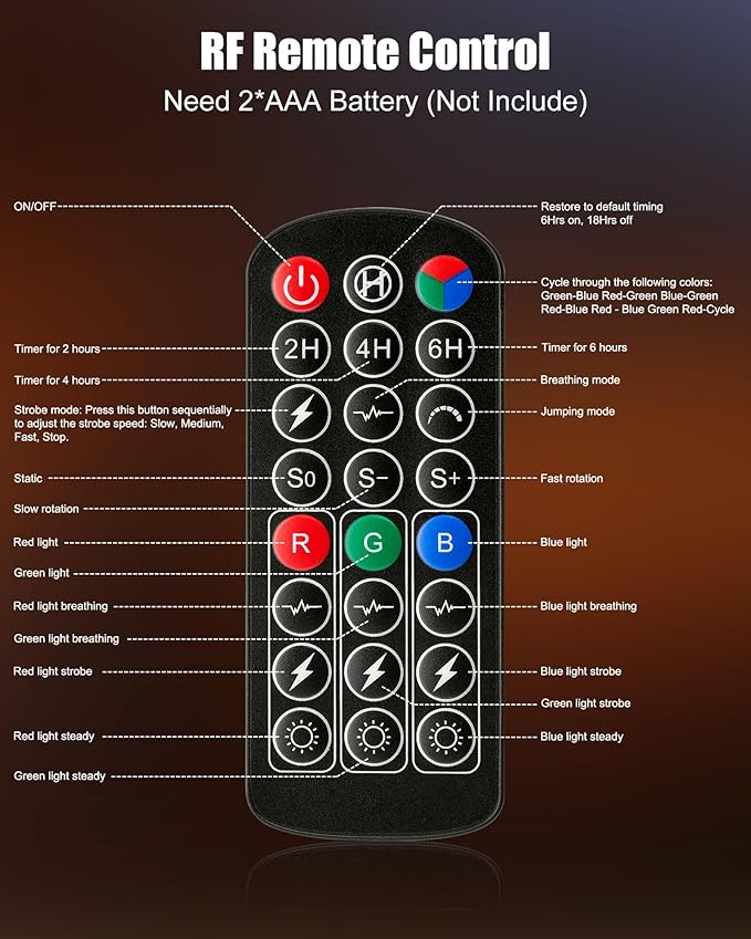 - Remote Control: Take command with the RF remote control, effortlessly powering the laser light projector on/off, selecting light colors, setting auto-cycle lighting modes, adjusting rotation speed and flash frequency, and scheduling timers (2H,4H, 6H) from a considerable distance