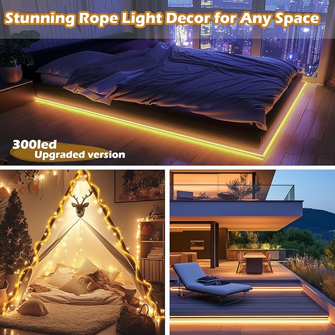 - ✨【Upgraded Solar Rope Lights】 98 feet 300 LEDs, features a built-in 1200mAh high-capacity battery, offers extended illumination for larger spaces. Its durable design ensures long-lasting performance.