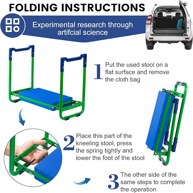 - Foldable Seat – garden kneelers for seniors is portable and easy to take, you just need three steps to fold gardening bench kneeler and seat for seniors, you can see that in our pictures. Put the used stool on a flat surface and remove the cloth bag, then press the spring tightly and lower the foot of the kneeling bench for gardening.