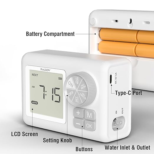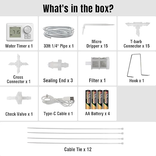 - Easy Installation: The Raddy WS-6 simplifies setup with a complete kit, including an auto water timer, 33-foot 1/4" tubing, check valve, Type-C cable, micro drippers, and various connectors. Simply connect the components, set it up, and let it water your plants automatically