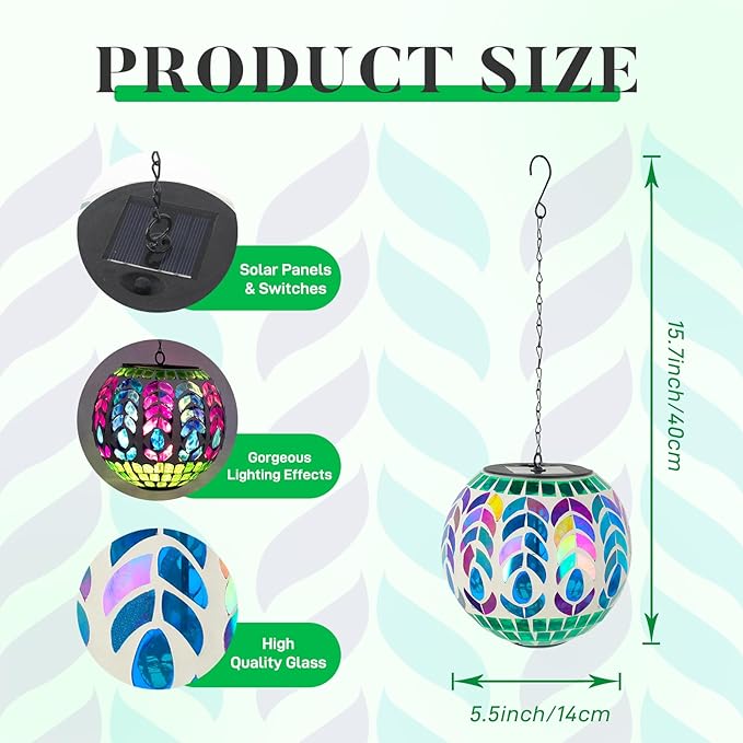 - 【Mosaic Design Decoration】Each solar outdoor lantern is meticulously crafted with high-quality mosaic glass gazing ball, featuring intricate patterns that cast beautiful, warm projections. The sturdy metal chain ensures durability, making these mosaic solar hanging lanterns perfect for enhancing the ambiance of any space.