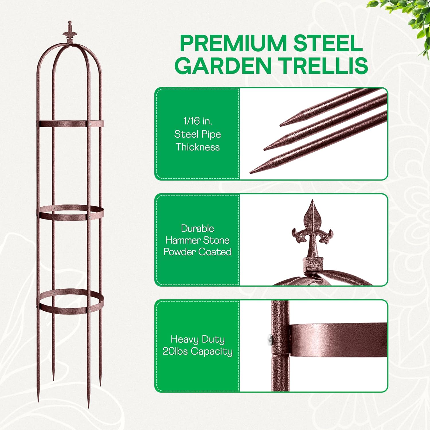 - π EASY TO ASSEMBLE AND VERSATILE USE: Simple setup for garden beds, pots, or landscaping; Our garden obelisk supports climbing plants like clematis, jasmine, or beans; Weighing just 5 pounds, the house plant trellis is lightweight and portable