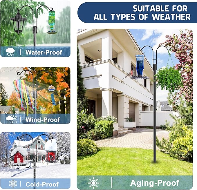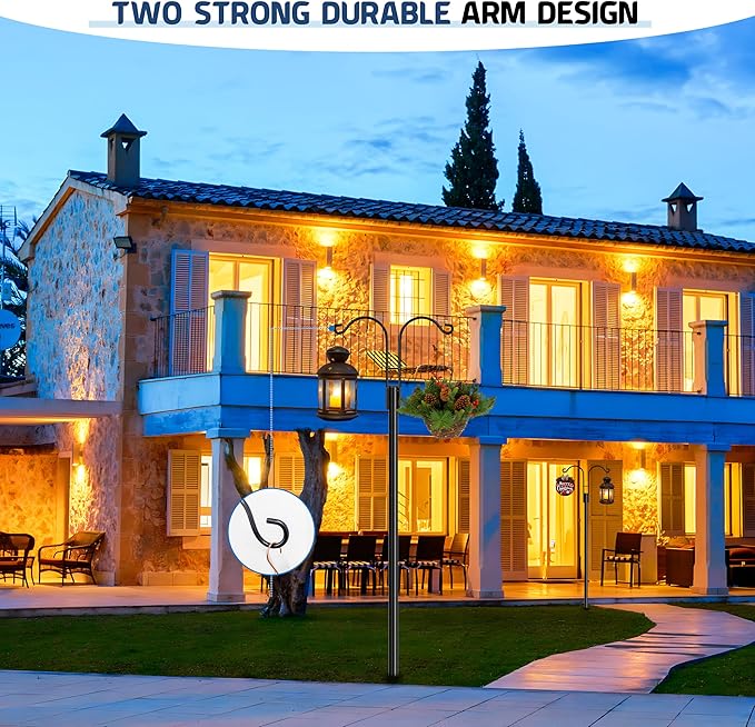 - Versatile & Multi-Purpose: Built with a sturdy frame and double-arm design, our outdoor shepherd's hook is ideal for hanging solar lanterns, flower baskets, plant pots, hummingbird feeders, wind chimes, and more. As shepherds hooks for outdoor, it adds charm and functionality to any outdoor space, making it the perfect accessory for gardens, patios, or backyards.