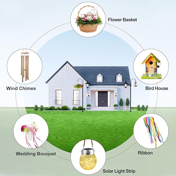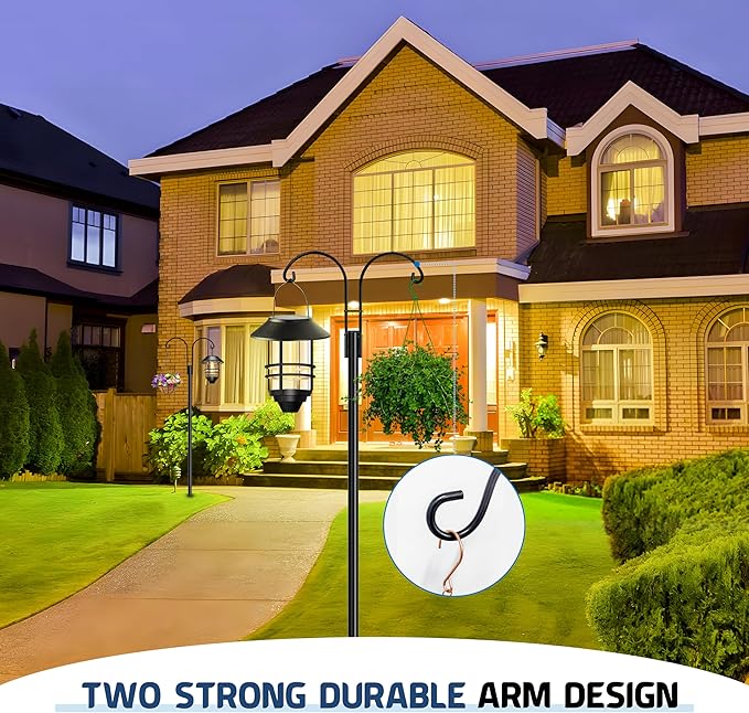 - Versatile & Multi-Purpose: Built with a sturdy frame and double-arm design, our outdoor shepherd's hook is ideal for hanging solar lanterns, flower baskets, plant pots, hummingbird feeders, wind chimes, and more. As shepherds hooks for outdoor, it adds charm and functionality to any outdoor space, making it the perfect accessory for gardens, patios, or backyards.