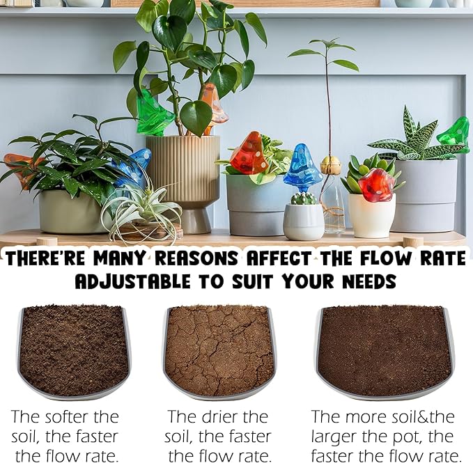 • 🌻PLANT WATERING SPIKES WHILE AWAY:No more worries about your plants when you're on vacation,traveling,business trip,any scenario where you need to leave the house. You can adjust the number of mushrooms placed,the angle of tilt,etc depending on how long you are away from home. Suitable for different plants. Like bonsa,pot plants,hanging plant,any outdoor&indoor plants.