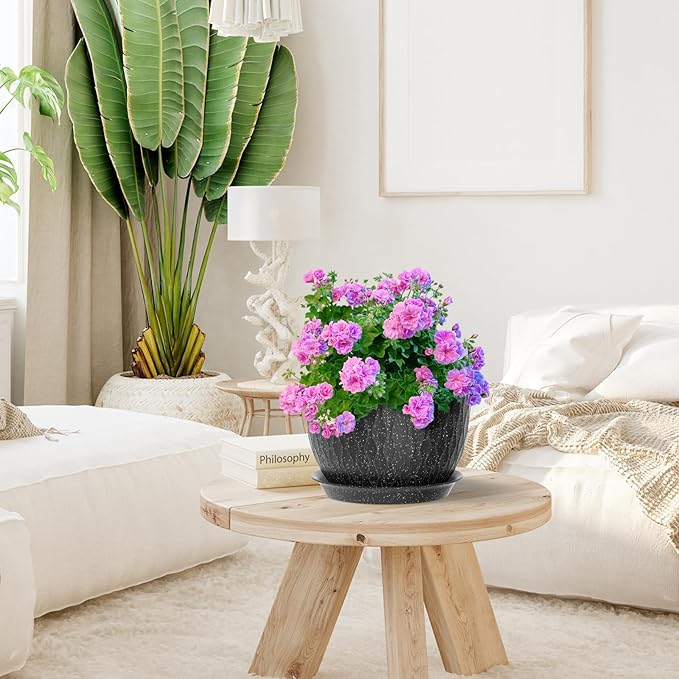 12/10/9 inch Large Flower Pots, 3 Set Big Plant Pots for Outdoor Indoor Plants with Water Ripples, Wide Plastic Planters with Drainage Holes and Saucers for Garden House Plants, Speckled Black