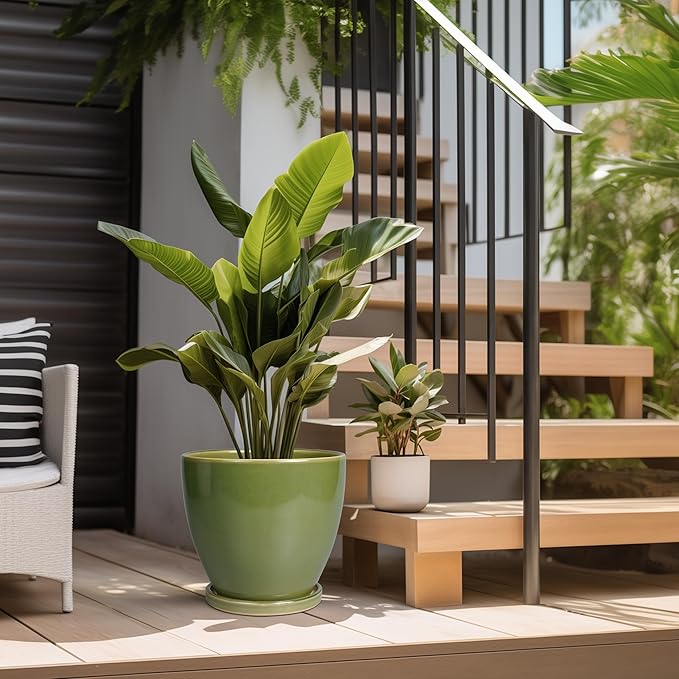 Ceramic Pots for Plants - 10 Inch Planter for Indoor Ourdoor Plants Modern Large Flower Pot with Drainage Hole and Saucer Room Home Office Garden Patio Porch Decor Green