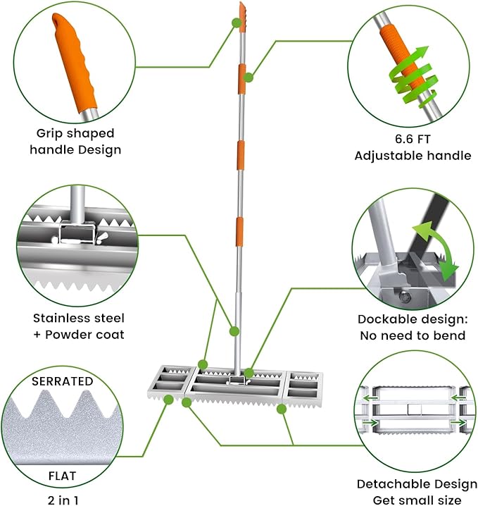 - 🏠【Detail Processing】①Lawn leveler is made of high-quality stainless steel + powder coat, rust-proof, sturdy and corrosion. It withstands heavy use and rough conditions, anti-scratch coated finish for durable use. ②6.6 FT long Adjustable handle can be easily assembly and disassembly length to match the different height needs. ③Ergonomic grip shaped handle design and Anti-slip rubber lets you cover more ground with less effort. and making it easy to maneuver and control.