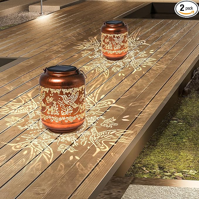 - 【Hummingbird Garden Decoration】The solar outdoor lantern is inspired by animal elements in nature. It projects bright hummingbird patterns in the dark, creating a gorgeous and warm atmosphere and bringing vitality and fun to your garden. It adopts a gold-copper color and hollowed-out metal finish, presenting a retro look.