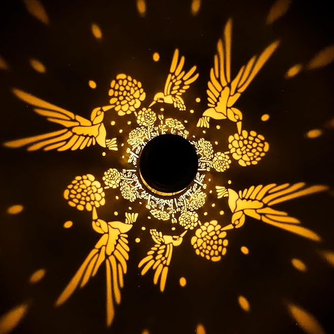 - Charming Solar Garden Lights: Enhance your garden with these stunning hummingbird solar lanterns. Featuring an intricate retro design with a gold-copper finish and hollow metal veneer, they cast warm, inviting light while creating beautiful hummingbird patterns. Perfect for gardens, patios, walkways, and porches, these elegant lanterns blend beauty with functionality, enhancing any outdoor environment with a graceful, atmospheric glow.