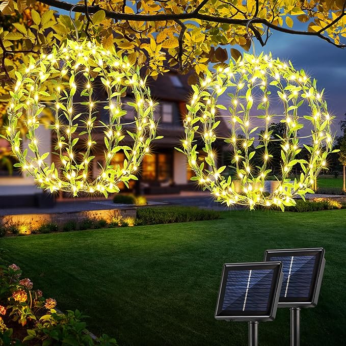 Joomer Solar Hanging Lights Outdoor, 2 Pack 12in 120 LED Solar Globe Lights, 8 Modes Waterproof Foldable Metal Sphere Light with Hook for Garden Yard Porch Decor-Warm White (Ball with Green Leaf)