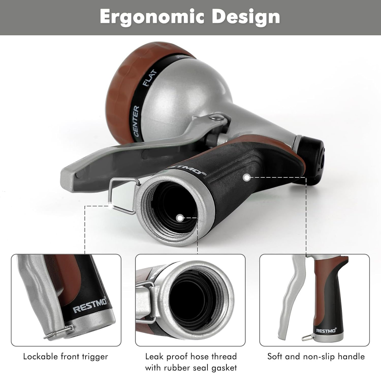 RESTMO Garden Hose Nozzle, Heavy Duty Metal Water Hose Nozzle with 7 Adjustable Spray Patterns, High Pressure Hand Sprayer with Flow Control, Best for Watering Plant & Lawn, Washing Car & Pet, Brown
