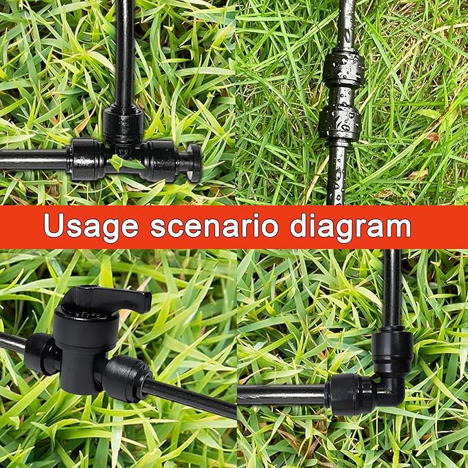 - 5.Products include: 5Pack1/4 inch elbow, 5Pack1/4 inch straight insert, 5Pack1/4 inch tee, 5Pack1/4 inch plug, 2Pack1/4 inch on-off valve, if you have any questions about our 1/4 inch irrigation accessories, please ask us via Amazon email, we will solve the problem for you as soon as possible, Give you a good shopping experience, but also please give our new products a growth opportunity, thank you very much