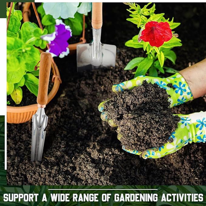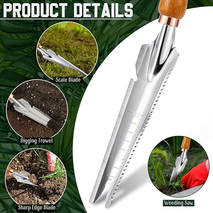 - Lanyard Design: made from stainless steel, it is lightweight and easy to store; The practical handle hanging hole design and rope make it convenient to store after use, keeping everything organized; Suitable for transplanting, planting, cutting, sawing, shoveling, loosening soil, measuring, etc. Ideal for outdoor gardens, flower beds, vegetable gardens, and indoor plants