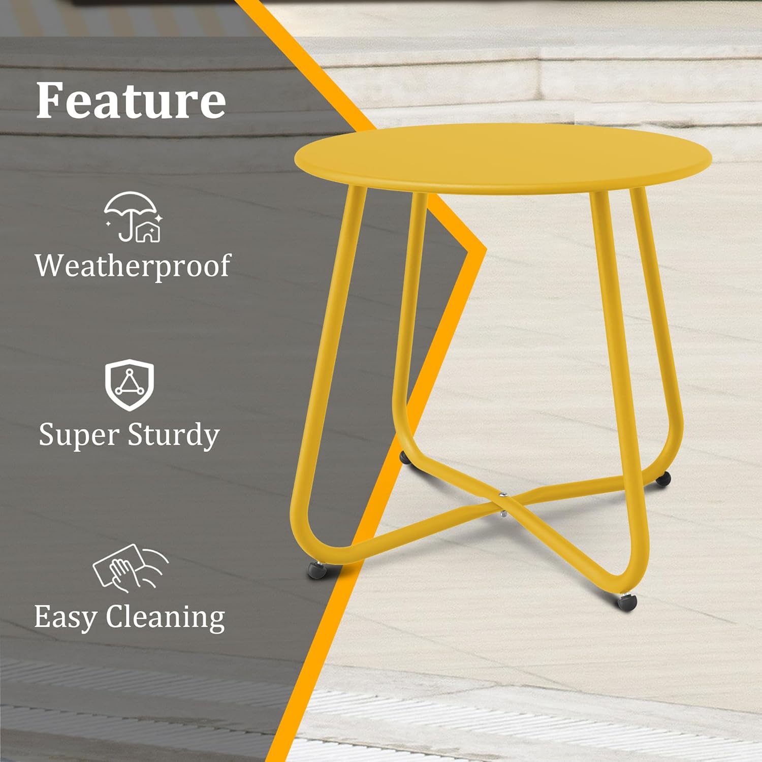 - Durability: Our small round table features an electrophoresis and powder coating technology that creates a glossy surface with anti-rust properties. Whether under the sun or in rainy conditions, this outdoor side table is built to endure. The powder coating is weather-resistant, waterproof, and won’t peel off. Additionally, it is scratch-resistant and UV-resistant, making it perfect for use in your yard or on your balcony.