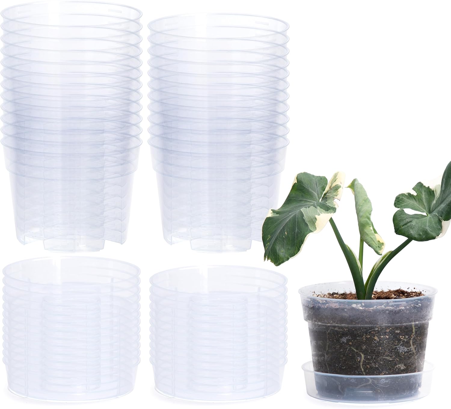6 Inch Clear Plastic Plant Pot with Drainage Holes, Interlocking & Detachable Tray - Deep Saucer - Durable BPA-Free Plastic, Transparent Design, Raised Base for Airflow, Set of 24, 92-X-C-4