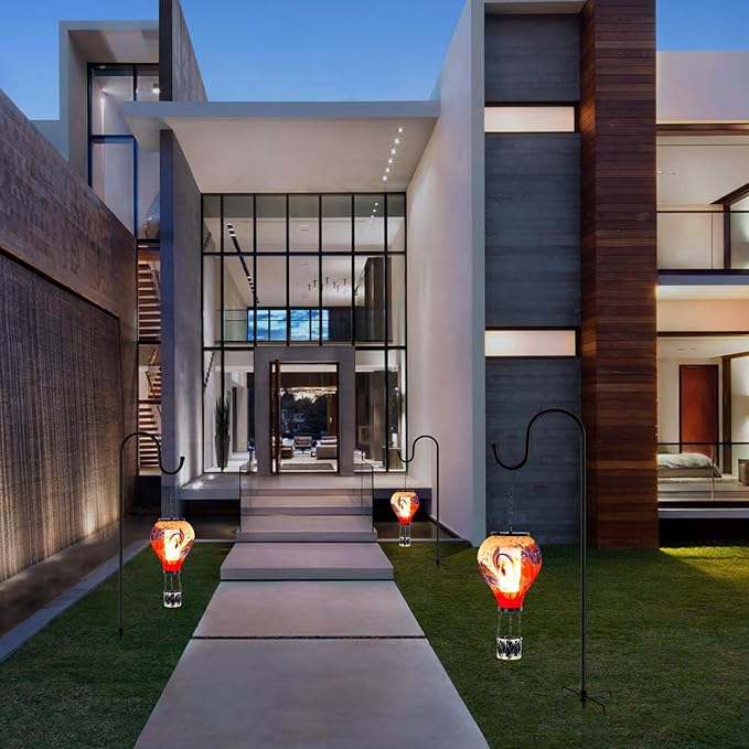 - 【Unique Hot Air Balloon Solar Lantern】These outdoor solar lanterns showcases a captivating gradient of colors, transitioning from a red at the base to a orange, and finally to a blue at the top, creating a striking visual. When the solar lantern is lit, they mimic a rising hot air balloon with a flickering flame, creating a beautiful effect and symbolizing warmth and good wishes.