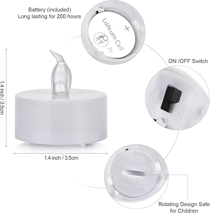 - 5.PACKAGE INCLUDE – 24pcs LED Flameless tea lights. Batteries are included and installed. On/Off sliding switch makes it easy to use.