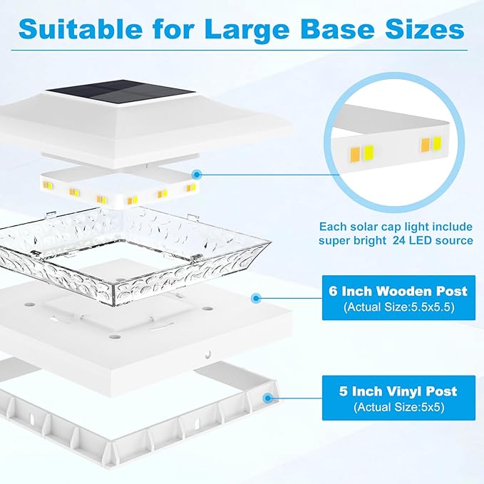 - Designed for Larger Post: The solar post cap lights are easy to install on top of any 5x5 inch vinyl post, 6x6 inch wood post. Easy to install, comes with mounting accessories and can be installed in minutes