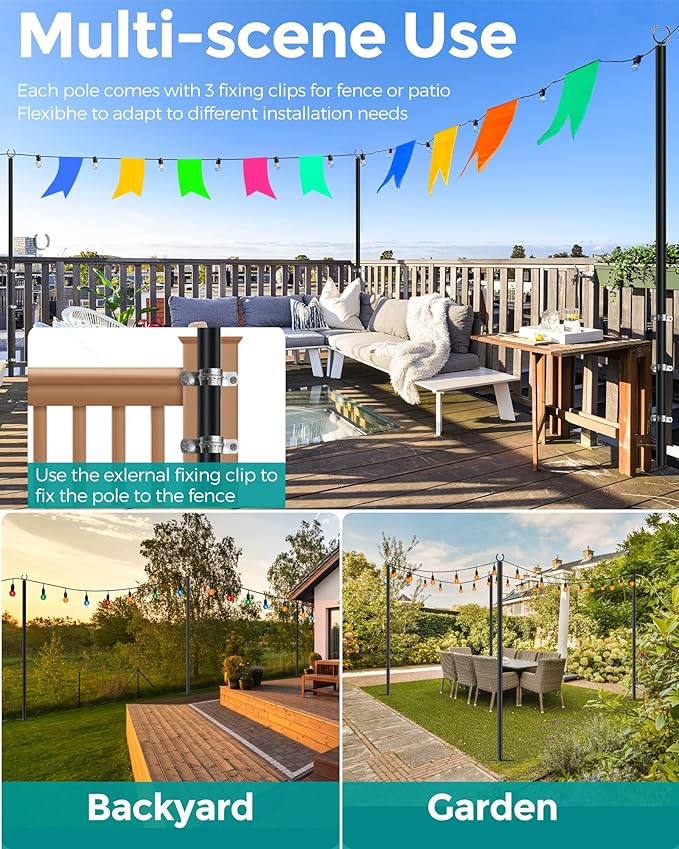 • Easy 5-Minute Assembly: Featuring a user-friendly 6-piece design, each light hanging pole comes with 3 fixing clamps. Simply connect the semi-circular head to the top pole, insert the fork into the bottom pole, and you're done! Alternatively, skip the fork and use the fixing clamps to attach the string light poles to fences. All accessories come with pre-threaded screw interfaces for quick and hassle-free assembly. It is also very quick to disassemble and store due to its own small size