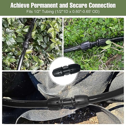 - Wide Compatibility: These 1/2" irrigation connectors parts are compatible with 1/2 inch irrigation tubing (1/2" ID x 0.65" OD). Ensure your 1/2" tubing's outer diameter is under 0.67" OD for compatibility. (NOTE: Pay attention to specifications before purchase.)