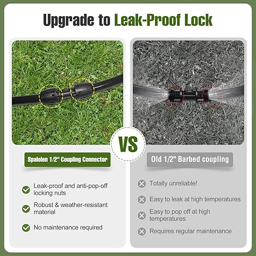 - Enhanced Locking Mechanism for Leak Prevention: Unlike 1/2" drip irrigation coupling connectors without locks, our 1/2 inch drip irrigstion fitting coupler connector feature a twist-lock mechanism that prevents tubing from popping off under high water pressure. The combination of a barbed design and locking system ensures a tight, stable connection that won’t loosen over time. Enjoy a secure, leak-proof drip irrigation system without the hassle!