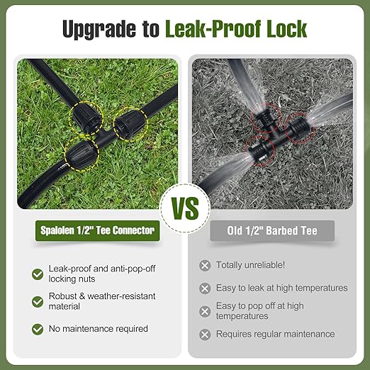 - Enhanced Locking Mechanism for Leak Prevention: Unlike 1/2" drip irrigation tee connectors without locks, our 1/2 inch drip irrigstion fitting tee connector feature a twist-lock mechanism that prevents tubing from popping off under high water pressure. The combination of a barbed design and locking system ensures a tight, stable connection that won’t loosen over time. Enjoy a secure, leak-proof drip irrigation system without the hassle!