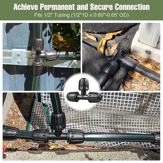 - Built to Last: The 1/2" drip irrigation parts tee connectors is made of sturdy, high quality plastic that is durable enough to withstand the rigors of outdoor use and not easy to deform and break. Say goodbye to the worry of traditional 1/2" barbed tee connectors that can fall off and leak in the heat and sun.