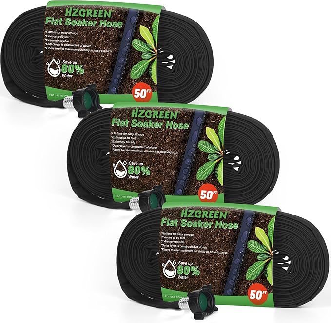 Flat Soaker Hose 50FT x 3 PACK,Drip Hose for Garden Beds Linkable Irrigation System Lightweight and Easy Watering for Tree Plant and Save 80% Water for You (150FT)