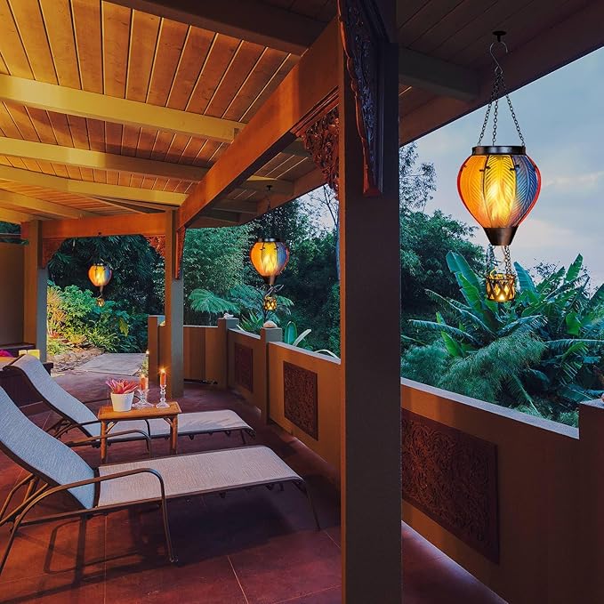 - 【Unique Hot Air Balloon Design】--This hanging solar light is composed of 8 pieces of stained glass with lifelike flame lights. As night falls, their glow adds warmth and comfort to your garden, patio, yard, path, and more, great Christmas decorative lights.