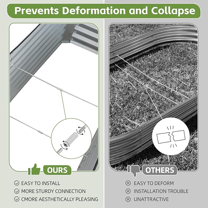 - 【 Superior Durability 】Made of 0.7mm thick zinc-coated steel with spray coating, our raised garden bed resists rust, corrosion, and deformation for 5x longer lifespan than thin competitors. Dual-folded edges ensure galvanized garden bed structural stability even in harsh weather.