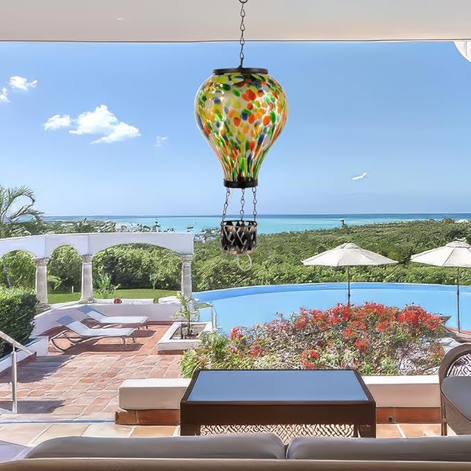 - 【Glass Hot Air Balloon Lanterns】The new hot air balloon solar lamp is no longer composed of multiple glass panels, but also a whole glass balloon. Glass solar lanterns can add color and charm to your garden during the day, and hot air balloons solar lantern lit at night can add a warm, romantic atmosphere to your garden.