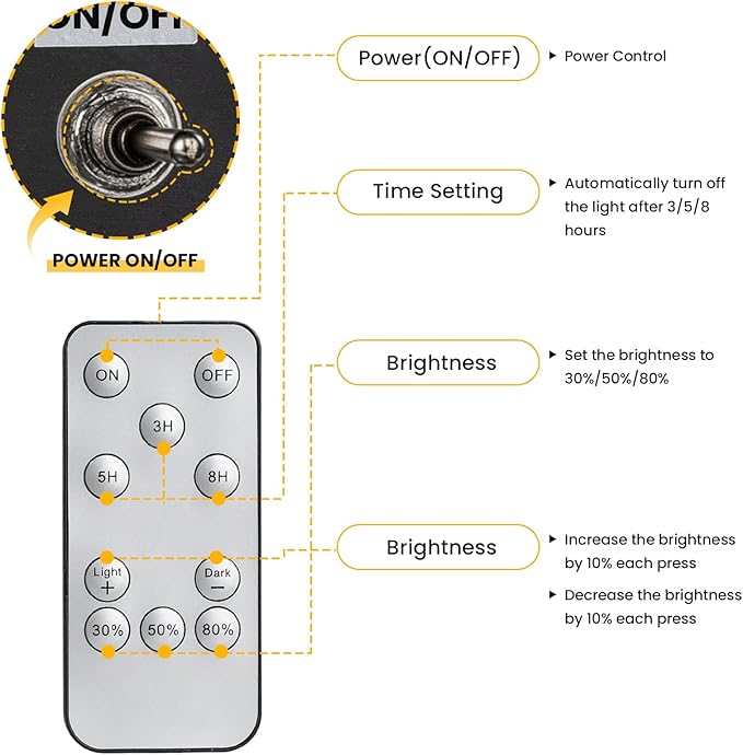 - Smart Remote Control | 3 Timer Modes + 10% Increment Brightness Customize ambiance or security with 3 preset timers (3H/5H/8H) and 3 adjustable brightness levels (30%-80%). Fine-tune brightness by 10% increments via remote—unmatched flexibility vs. rigid 30% steps in other brands. Pre-installed bulb and steel-reinforced base ensure 1-minute setup.