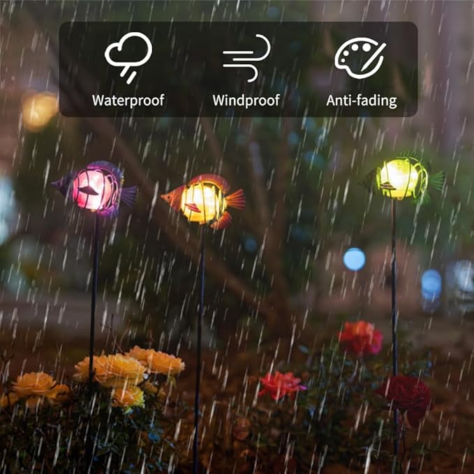 - Unique Solar Lights:A set of garden solar lights includes three small fish in different colors. You can place them anywhere to add a relaxing ocean ambiance to your life effortlessly. The decorative solar garden stakes will bring you unexpected visual effects