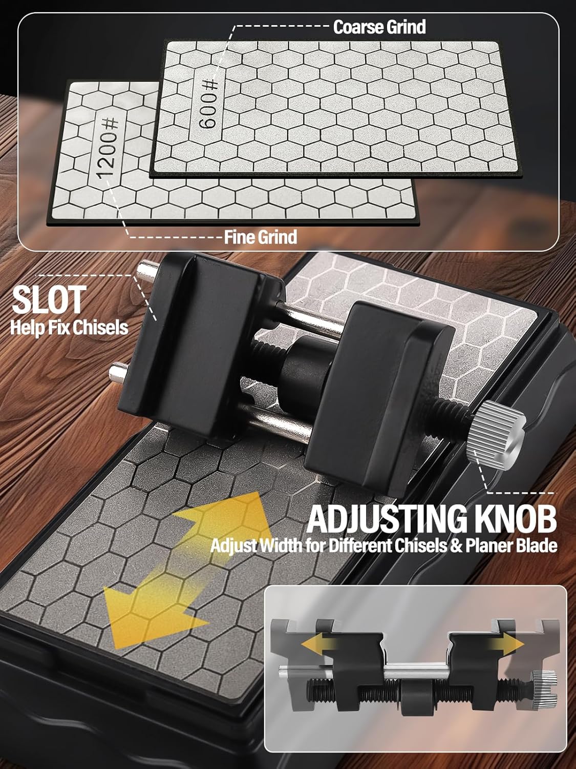 - Professional Sharpening System: Chisel sharpening kit includes 600/1200 grit double-sided honeycomb surface plate, non-slip base, honing guide and angle guide, which is a complete honing tools set for sharpening knives, planes, chisels and other cutting tools.