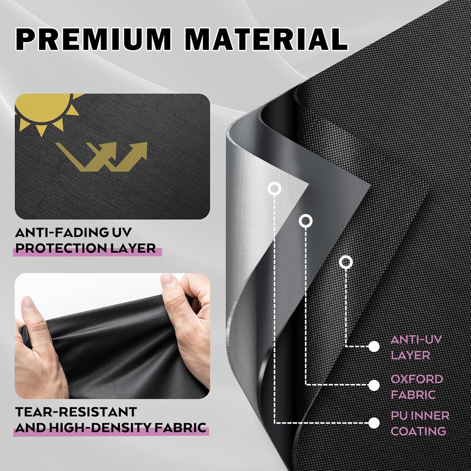 - ANTI-TEAR MATERIAL – Designed to be long lasting, this grill cover is made of high-density 420D oxford fabric with reinforced stitching, which is lightweight but durable materials that can withstand harsh weather conditions and resist tearing, fading, and other types of damage