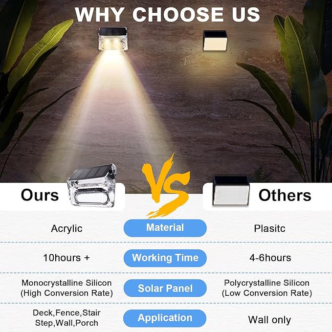 - đ ăIP65 Waterproof & Long Working TimeăThe Solar Fence Lights are made of high-quality acrylic and high-strength ABS material, with an IP65 waterproof rating, ensuring the long-term durability of the step lights. In addition, the solar outdoor lights installed on the fence can withstand various extreme weather conditions, bringing you a more comfortable outdoor experience.
