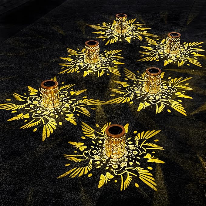 - Graceful Design:The retro appearance, with gold copper color and hollow out metal veneer, the solar hummingbird outdoor lanterns casts bright and warm light in night, accompanied by gorgeous and graceful hummingbird patterns, adding a beautiful atmosphere to the surrounding environment.