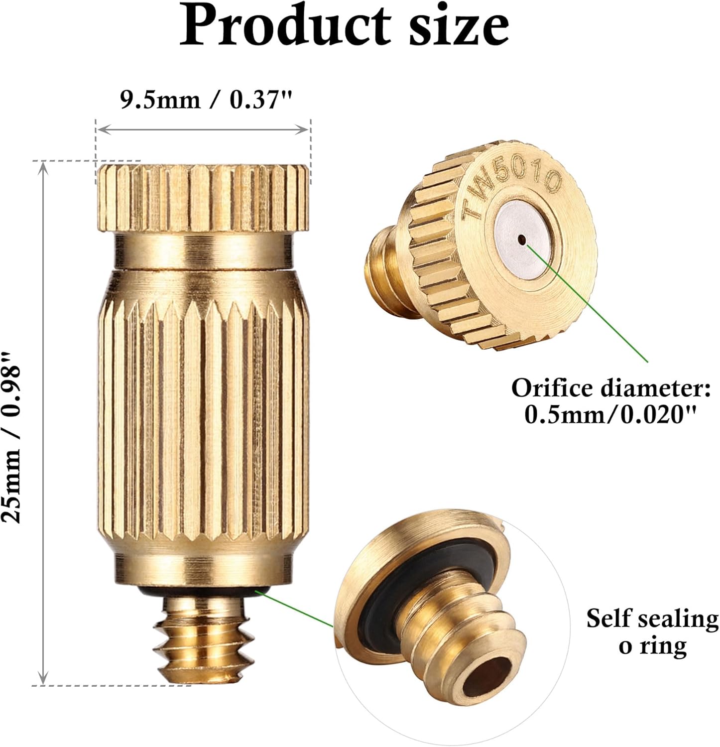 - 【Brass Misting Nozzles】: Made of premium brass, Mornajina brass misting nozzle replacement heads equipped with leak proof self sealing o ring, no tape or sealant is required. Atomizing Misting Sprayer outer diameter: 0.35inch, thread size: UNC 10-24, orifice diameter: 0.5mm (0.020"). Screw into any 10/24-threaded mist nozzle opening.