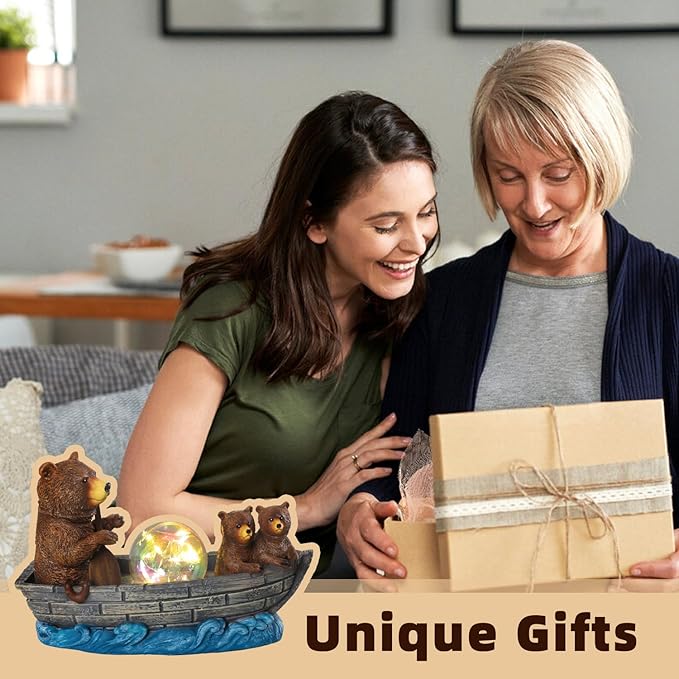 • Mother and Baby Bear Boating Statue:A mother bear rowing a boat,her two children on the other side,with a ball light in the middle,this image is so realistic and cute that it overflows with a warm and caring atmosphere.Day or night,this solar statue will be a beautiful addition to any indoor or outdoor space.