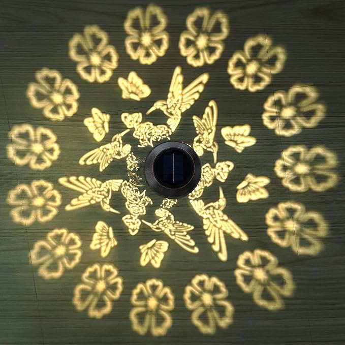- Refined Hummingbird Design: This solar garden light features an charming hummingbird and floral cutout with a vintage copper metal finish. When illuminated, it casts stunning light patterns, creating a warm and inviting ambiance for your outdoor spaces. A beautiful addition to your solar walkway lights outdoor setup, perfect for enhancing yards, pathways, patios, and gardens