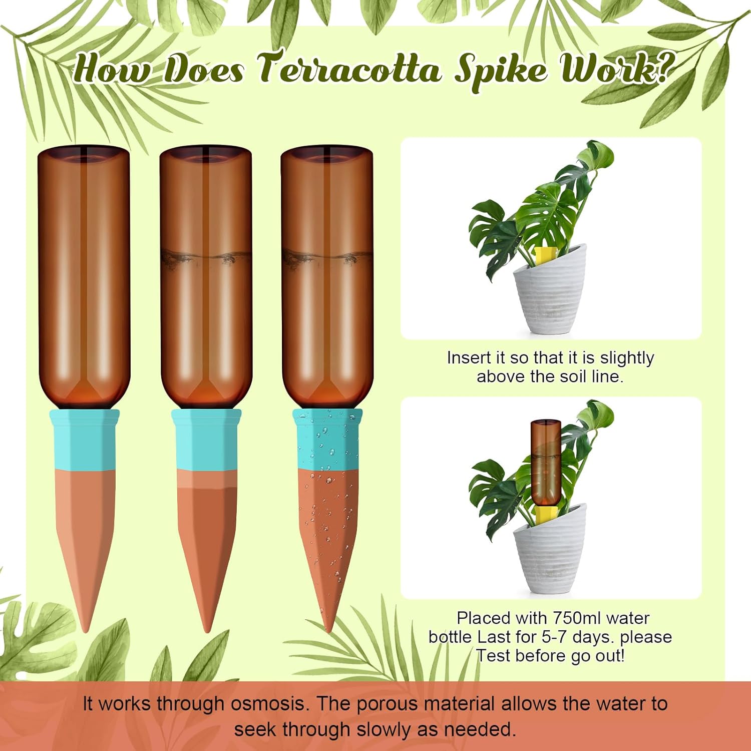 - Convenient Watering: our terracotta watering spikes have a slow release permeation function that ensures your plants get the right amount of water; Simply water the soil and dig a hole, deeply insert the plant watering stake into the hole until the opening is level with the soil; When the bottle needs refilling, just lift the empty bottle, refill it, and repeat the operation
