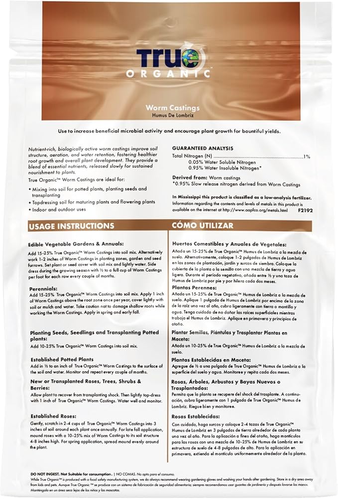 - Boosts Microbial Activity: True Organic Worm Castings enhance soil biology, fostering a rich environment that encourages healthy plant growth and higher yields.