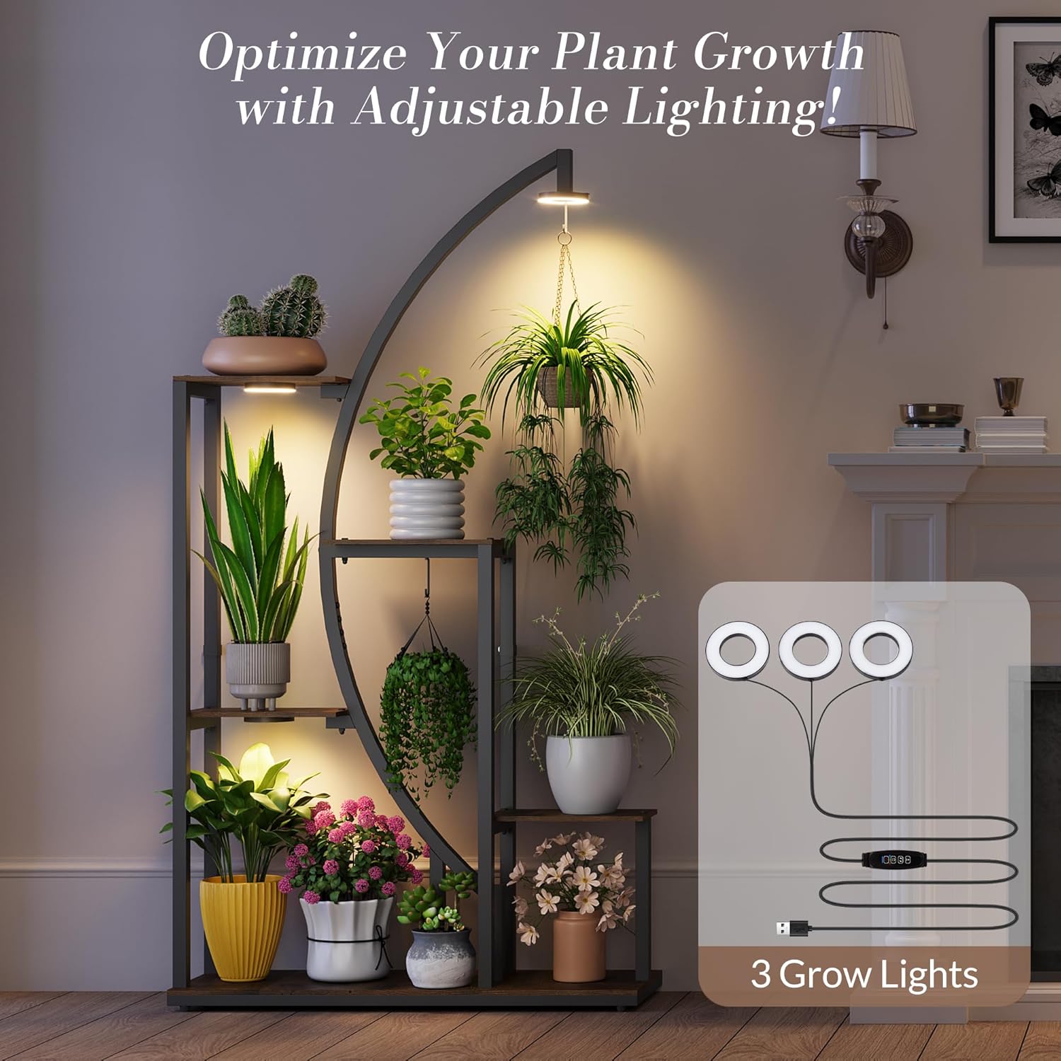 - Plant Stand with Adjustable Grow Lights: This plant stand with grow lights provides full-spectrum lighting to support healthy plant growth. Equipped with adjustable brightness, three lighting modes, and a timer function (3H/9H/12H), the three-head grow light ensures that all plants receive sufficient light, promoting photosynthesis. This lighted plant shelf keeps them thriving year-round, even in low-light spaces. Includes a UL-certified 5V/2A adapter for safety and efficiency.