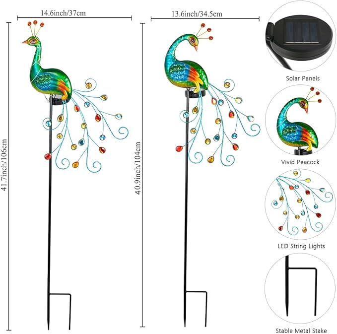 - Peacock Solar Lights: Designed in the shape of a peacock and its colorful body, solar lights outdoor waterproof are adorned with colored gemstones at the tail, perfectly showcasing their unique elegance both day and night